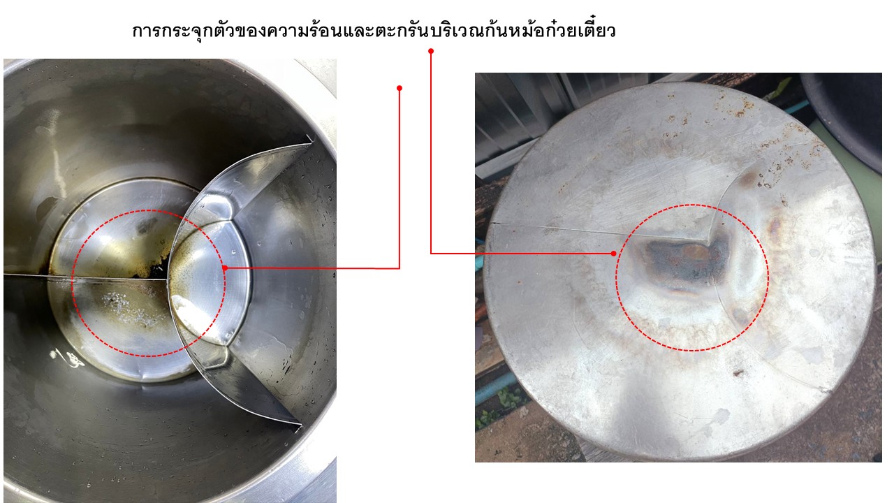 ปัญหาที่เกิดขึ้นจะพบมากบริเวณรอบ ๆ ช่องแบ่งของหม้อก๋วยเตี๋ยวที่อยู่กึ่งกลางหม้อและเป็นตำแหน่งที่ได้รับความร้อนสูงสุด