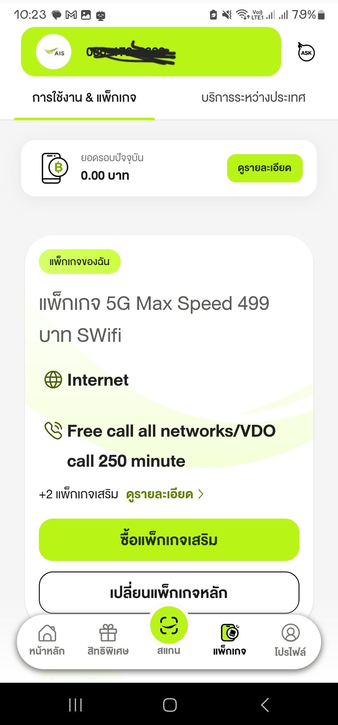 ปกติผมใช้แพ็กเดือนละ 200บ.(รวมVAT) เน็ต 5G 5GB และ เน็ตเร็ว 15Mbps ใช้ได้ 50GB จากนั้น 1Mbps, โทรทุกเครือข่ายสูงสุด 15นาที/ครั้ง ส่วนเกิน 0.99บ./นาที, AIS SUPER WiFi ไม่จำกัด นาน 6เดือน (กรณีมียอดเงิน