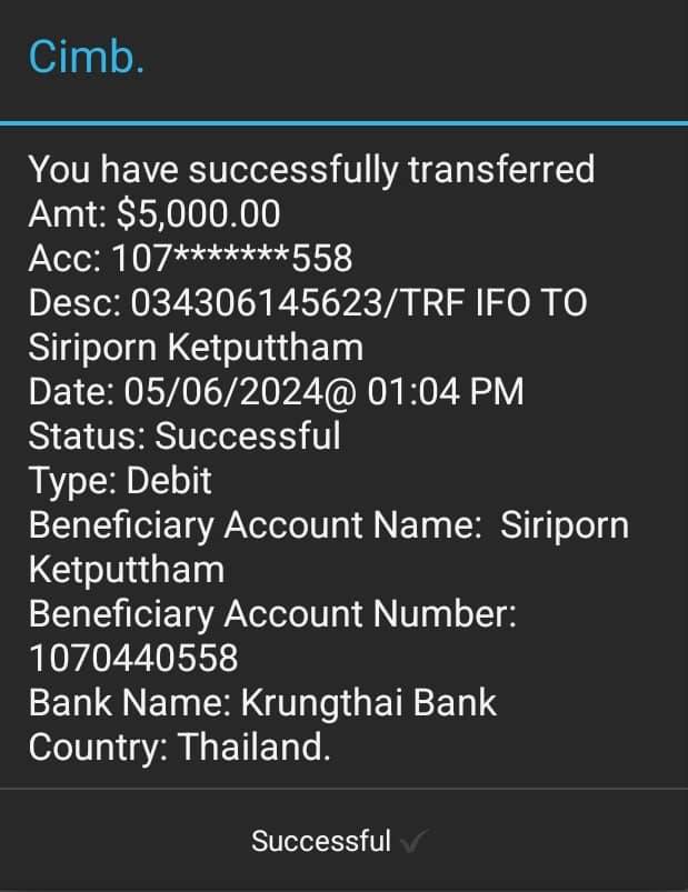 อยากรู้คะ ว่ามีคนโอนเงินมาให้จากมาเลเซีย โอนให้ผ่าน ธ.กรุงไทย