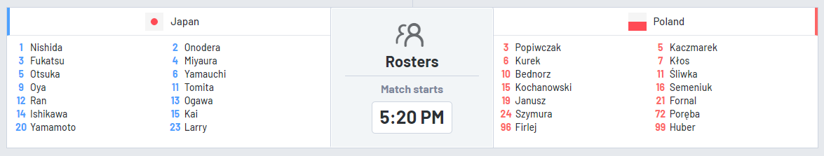 20.15Belgium🇧🇪 - Thailand🇹🇭Mexico🇲🇽 - Chinese Taipei🇹🇼Brazil🇧🇷 - Japan🇯🇵Türkiye🇹🇷 - Poland🇵🇱 21.00Netherlands🇳🇱 - Italy🇮🇹