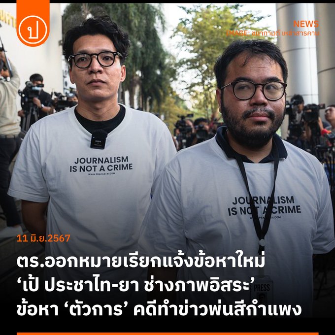 “เป้ ประชาไท” และ “ยา ช่างภาพอิสระ” ได้รับหมายเรียกจาก สน.พระราชวังให้ไปรับทราบข้อหาเพิ่มเติมในคดีที่เกิดจากเหตุพวกเขาไปทำข่าวนักกิจกรรมพ่นสีกำแพงวัง หลังอัยการสั่งให้ตำรวจสอบสวนเพิ่มและแจ้งข้อหาใหม่จากเดิมที่เป็น “ผู้สนับสนุน” มาเป็น “ตัวการ”