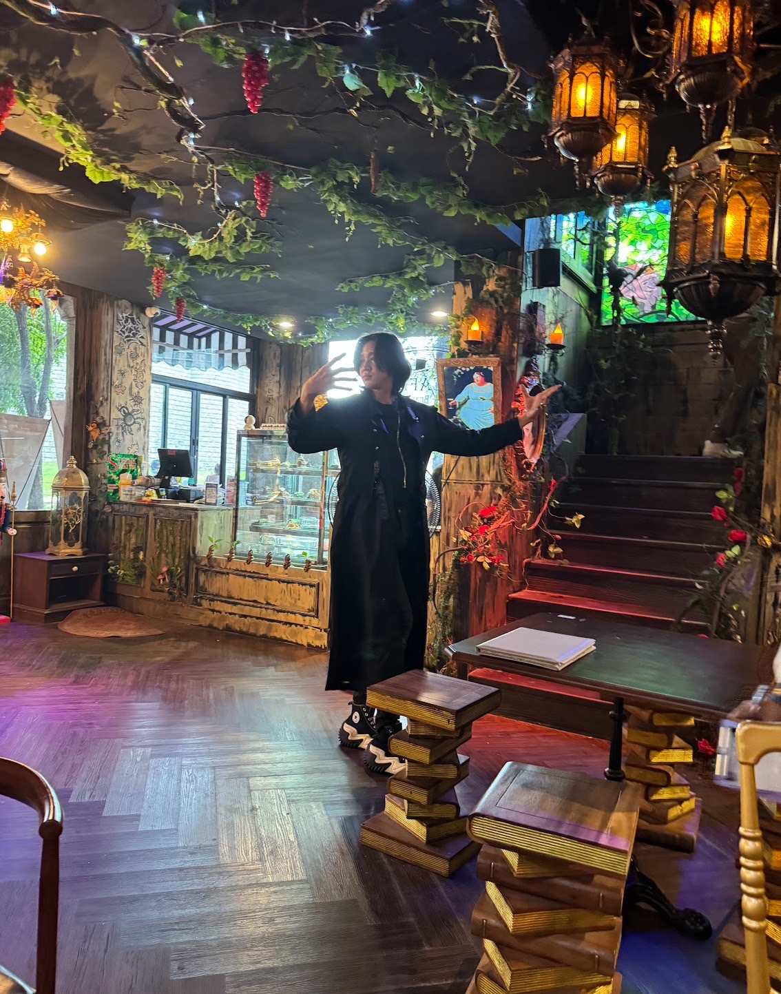 จุดเด่น: การตกแต่งภายในร้านเน้นไปที่ธีมเวทมนตร์ มีการใช้สีเข้มและของตกแต่งที่เกี่ยวกับเวทมนตร์ เช่น หนังสือเวทมนตร์, เครื่องราง, และอุปกรณ์เวทมนตร์ต่าง ๆ
