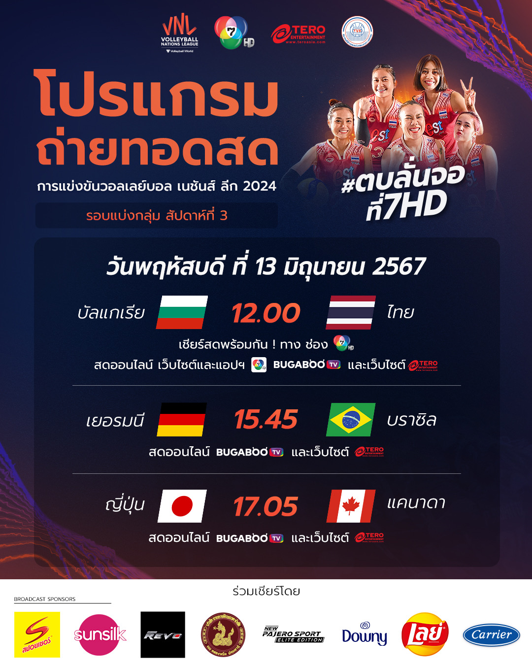 โปรแกรมถ่ายทอดสด VNL 2024 13 มิถุนายนนี้