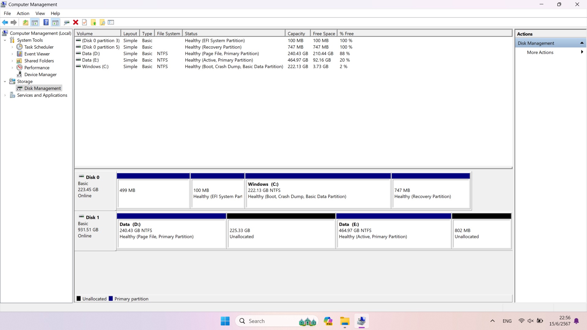 คือผมลงวินโดว์ใหม่ ผม format แค่ไดร์ฟ C แต่ไดร์ฟ D ไม่ได้ทำเพราะอยากเก็บข้อมูลไว้อยู่ หลังจากลงเสร็จ ผมมาดูใน This pc ปรากฏว่า ไดร์ฟ D หายไปเลยไปดูใน Disk Management ตอนนี้ที่ผมเห็นคือ (C) (Disk 0 pat