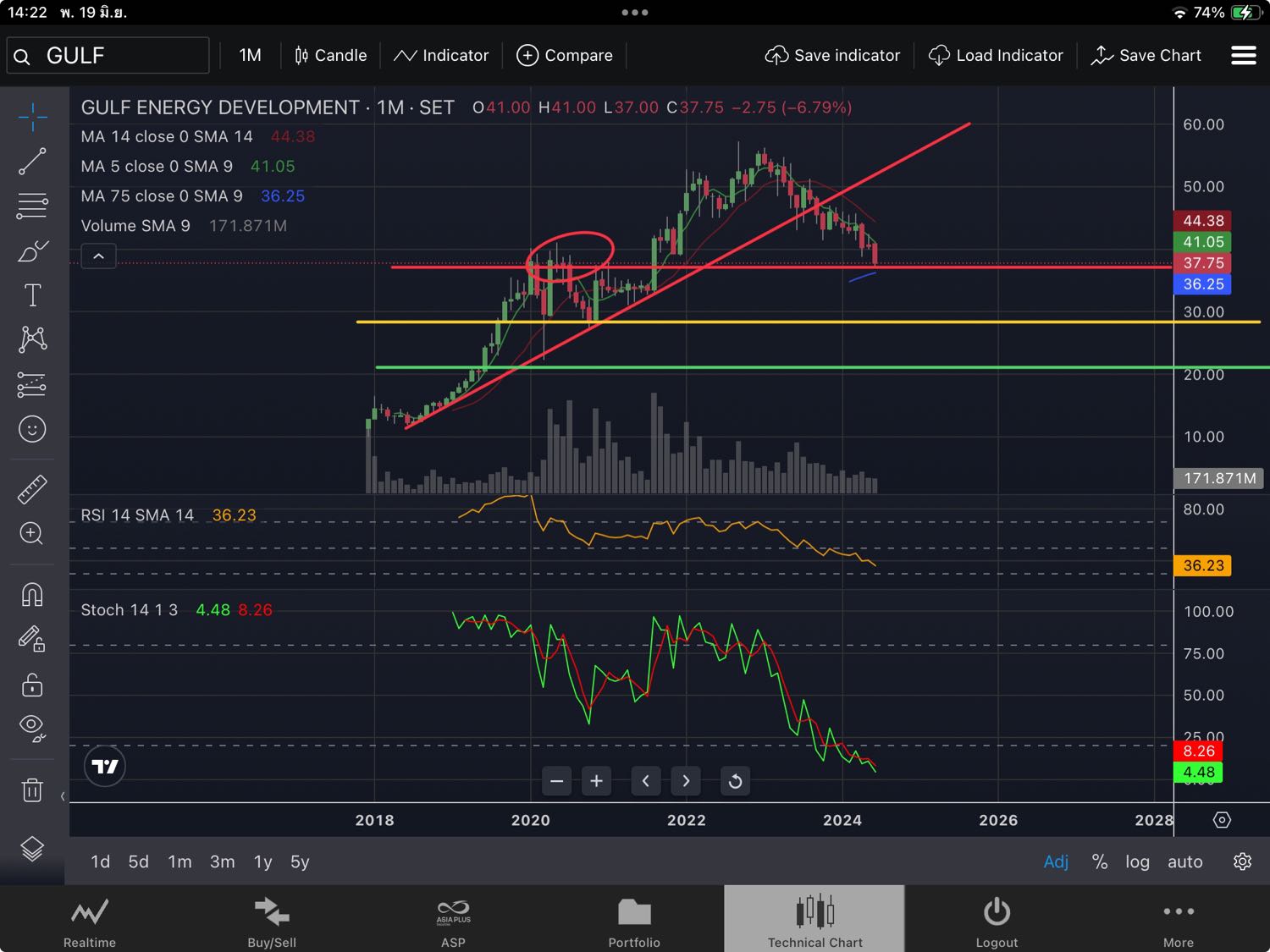 เคยตั้งใจรอ แนวรับ 37 แต่วันนี้ ดูท่าจะ น่าจะเอาไม่อยู่ ถึงเด้งก็เพื่อลงต่อ