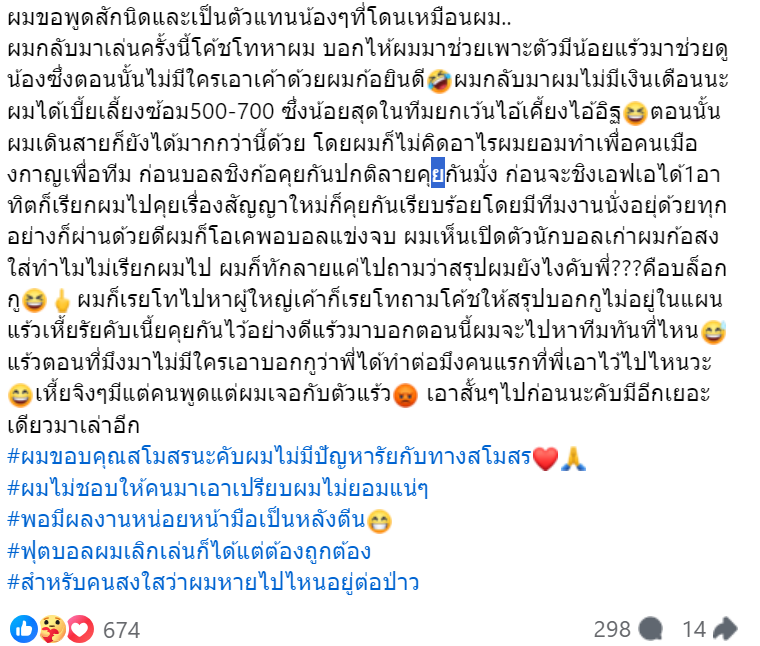ส่วนใคร ดึงน้อง ๆไปแปะเวป พนัน น่าจะโดนหนัก ๆนะครับ - สโมสรเปิดคัดนักบอล ได้นักกีฬา 16 คน ส่วนใหญ่เป็นนักเตะมหาวิทยาลัย และเล่นเดินสายควบคู่ไปด้วย มีเวลาซ้อม 8 วันเดินทางไปแข่ง ไม่มีเงินเดือน ไม่มี