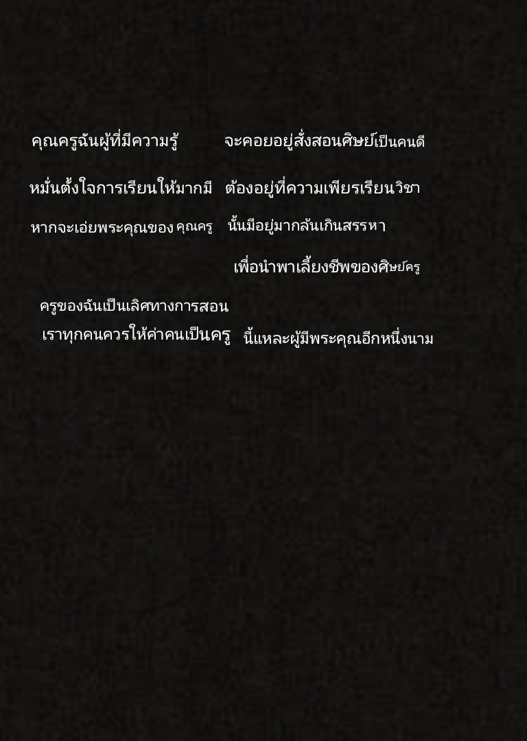 เวลา วารี ไหลไปมิย้อนกลับ ทางเดิน คนจริง มิเหลียวหลัง แรกรุ่น ก้าวข้ามฤดู มีพลัง มิรอรั้ง พุ่งไป เส้นชัยปอง ร้อนแดด ฝนหนาว หลายคราวผ่าน ล้วนถึงกาล งานเลิก ให้ลาถอย ผ่านชีวิต มากล้วน ทิ้งร่องรอย แดดอ่อ