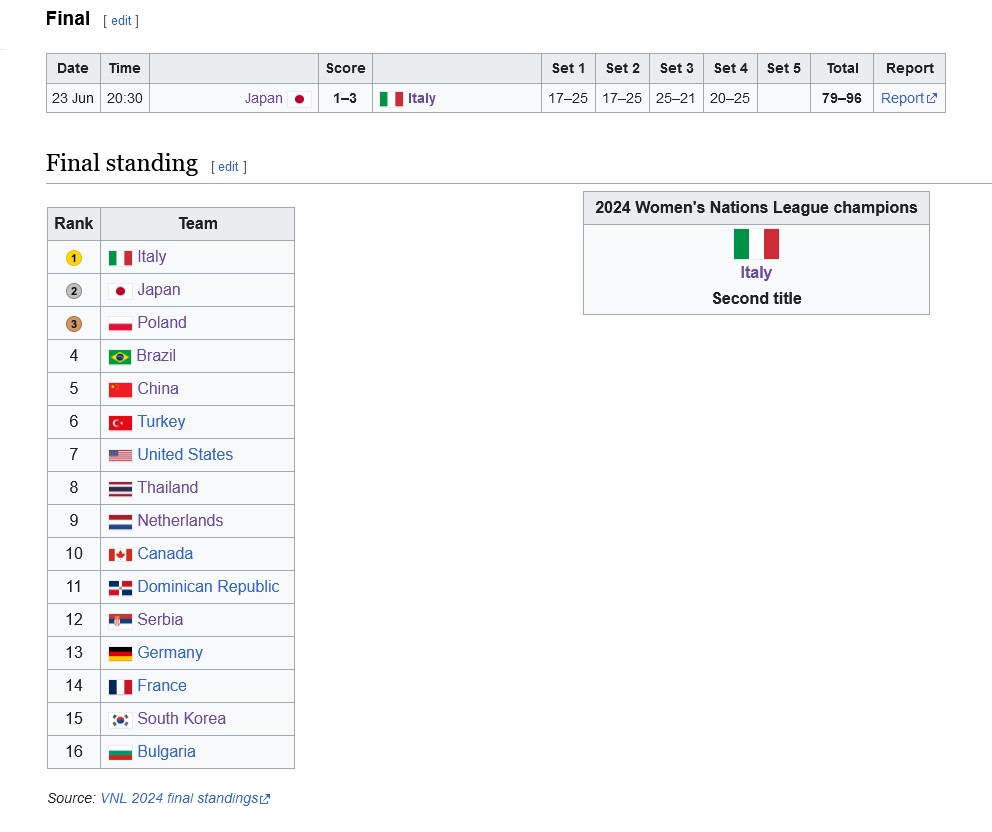 สรุปอันดับ VNL 2024 Women อิตาลีแชมป์(ที่2ของตารางรอบแรก) ญี่ปุ่นรองแชมป์