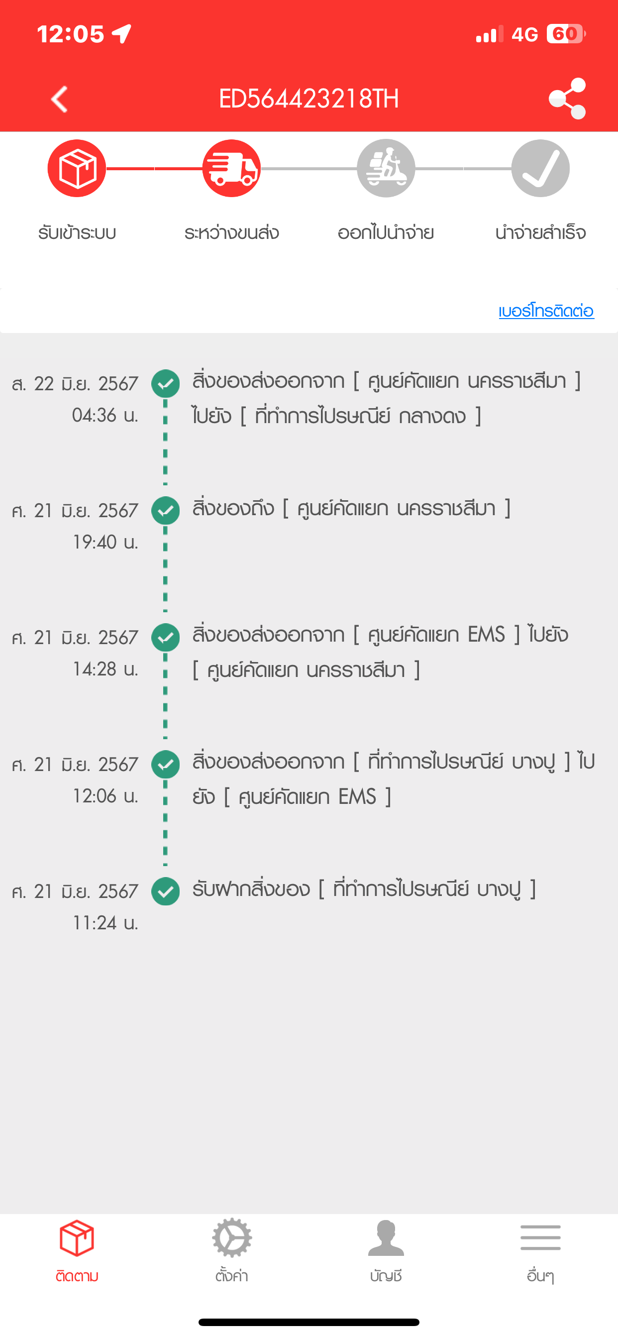 สาเหตุที่ร้องเรียน ออกจากศูนย์คัดแยกขอนแก่นตั้งแต่เมื่อวาน22:50 ต้องให้ผมรออีกนานแค่ไหนครับคุณพี่ กว่าจะถึงศูนย์คัดแยก EMS ตอนนี้ที่ผมทักมามันก็16:40แล้ว ครบ24ชั่วโมงที่ส่งแล้ว ปกติไม่นานขนาดนี้ ปกติว