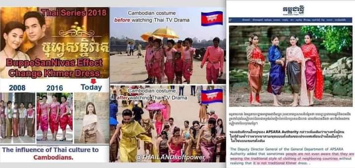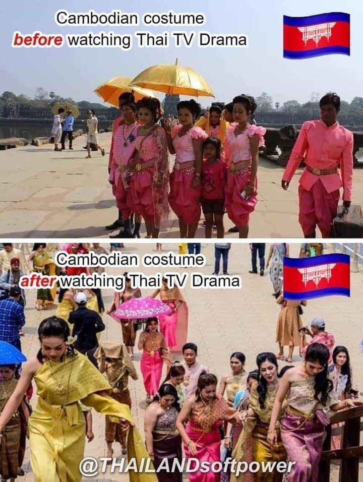 พอละครบุพเพสันนิวาสฟีเวอร์เป็นที่โด่งดังไปทั่วเขมรก็จะแห่ใส่ชุดไทยห่มสไบทำทรงผมมหาดไทยตามรอยแม่การะเกดในละครกัน คือเข้าใจนะว่าตามรอยละครได้แต่จะมาเคลมว่าเป็นของตัวเองและเป็นคนคิดเองมันได้หรอแถมยังด่าป