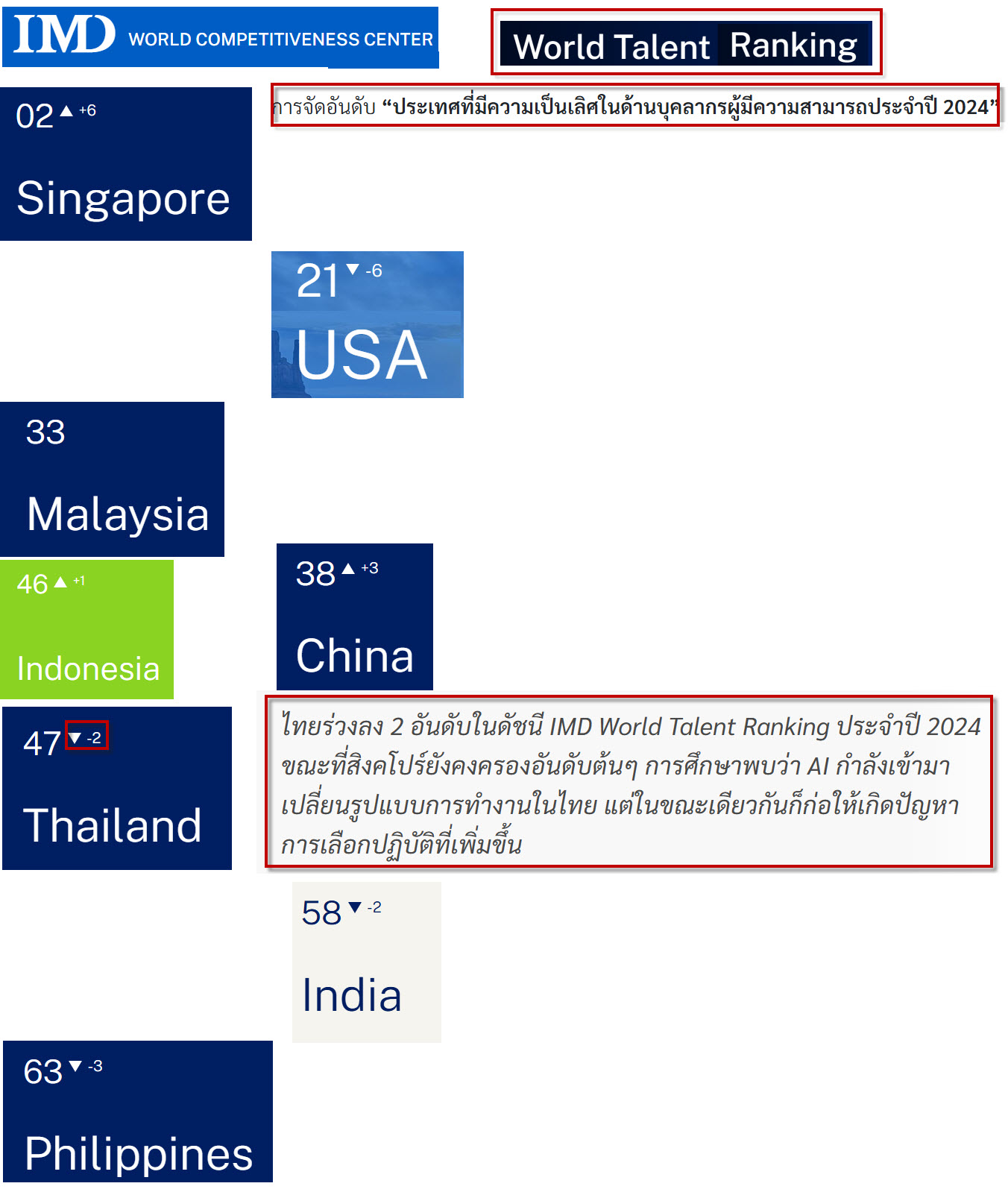 แต่ไทยร่วงลง 2อันดับใน การจัดอันดับ “ประเทศที่มีความเป็นเลิศในด้านบุคลากรผู้มีความสามารถประจำปี 2024”