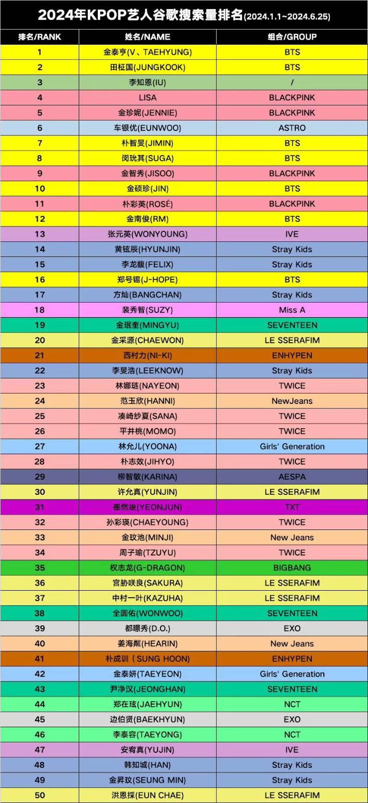 ใน50อันดับแรกมี3วงk-popที่มีรายชื่อเมมเบอร์ติดอันดับครบทุกคน คือ