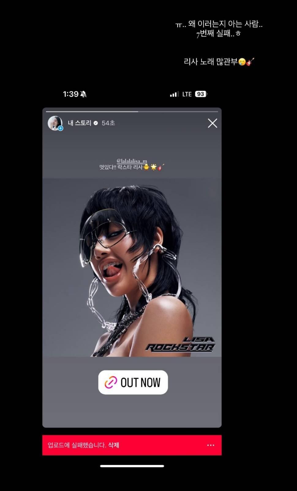 “ㅠ..มีใครรู้บ้างไหมว่าทำไมถึงเป็นแบบนี้..ฉันโพสต์ไม่สำเร็จถึง 7 ครั้ง..ฮ่า ช่วยมอบความรักและสนับสนุนเพลงของลิซ่าเยอะๆด้วยนะ🥲🎸”