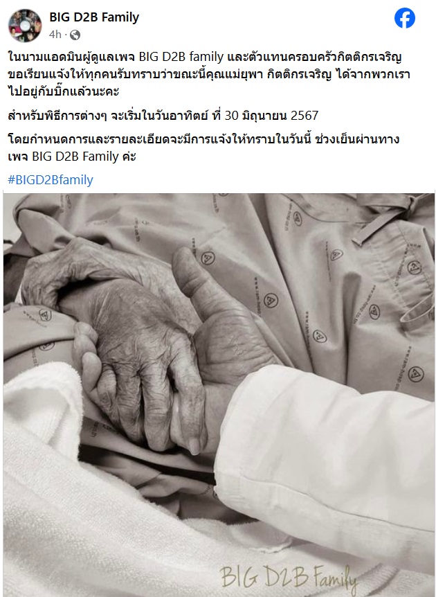 โดย BIG D2B family ได้โพสต์ข้อความแจ้งข่างเศร้าระบุว่า “ในนามแอดมินผู้ดูแลเพจ BIG D2B family และตัวแทนครอบครัวกิตติกรเจริญ ขอเรียนแจ้งให้ทุกคนรับทราบว่าขณะนี้คุณแม่ยุพา กิตติกรเจริญ ได้จากพวกเราไปอยู่กับบิ๊กแล้วนะคะ สำหรับพิธีการต่างๆ จะเริ่มในวันอาทิตย์ ที่ 30 มิถุนายน 2567”
