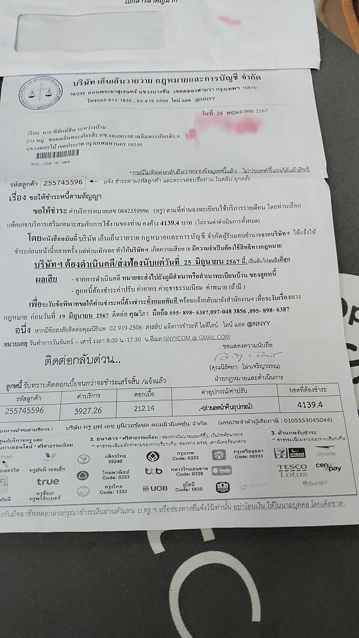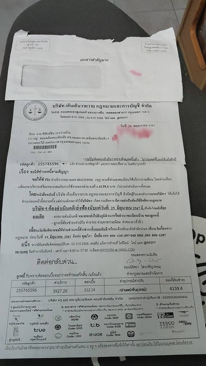 จดหมายจาก บริษัท สำนักงานกฎหมายธญาณชัย ส่งมาที่ออฟฟิศที่ทำงาน ยอดตั้งแต่เดือนเมษา-ธันวา ปี66 ซึ่งช่วงเมษาปี66 เราได้ย้ายที่อยู่ใหม่และยังไม่ได้ไปยกเลิกบริการ และช่วงเวลานั้นทางทรูได้ติดต่อมาให้ชำระค่า