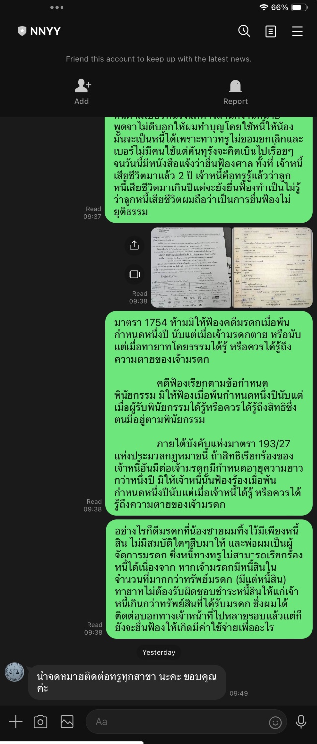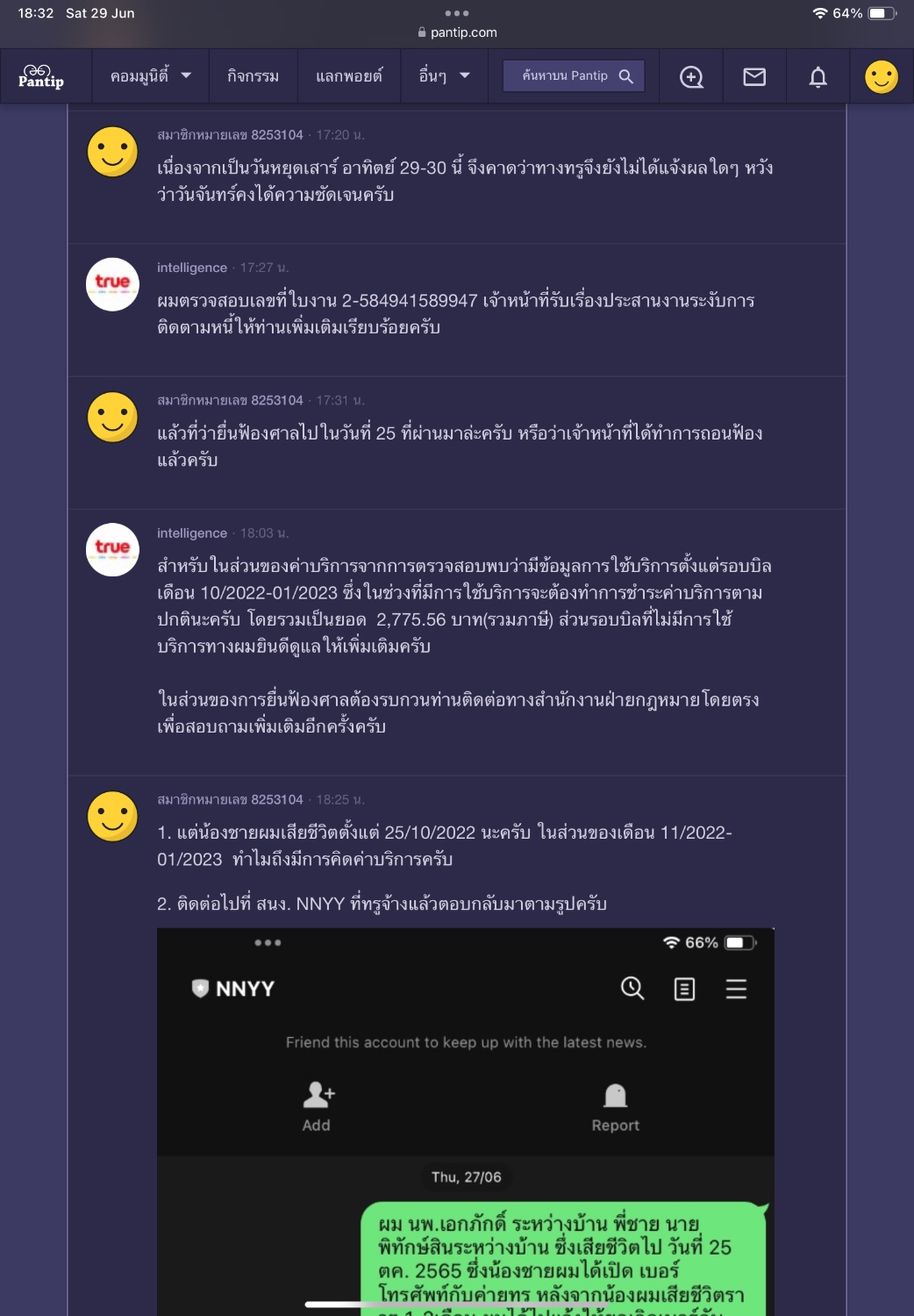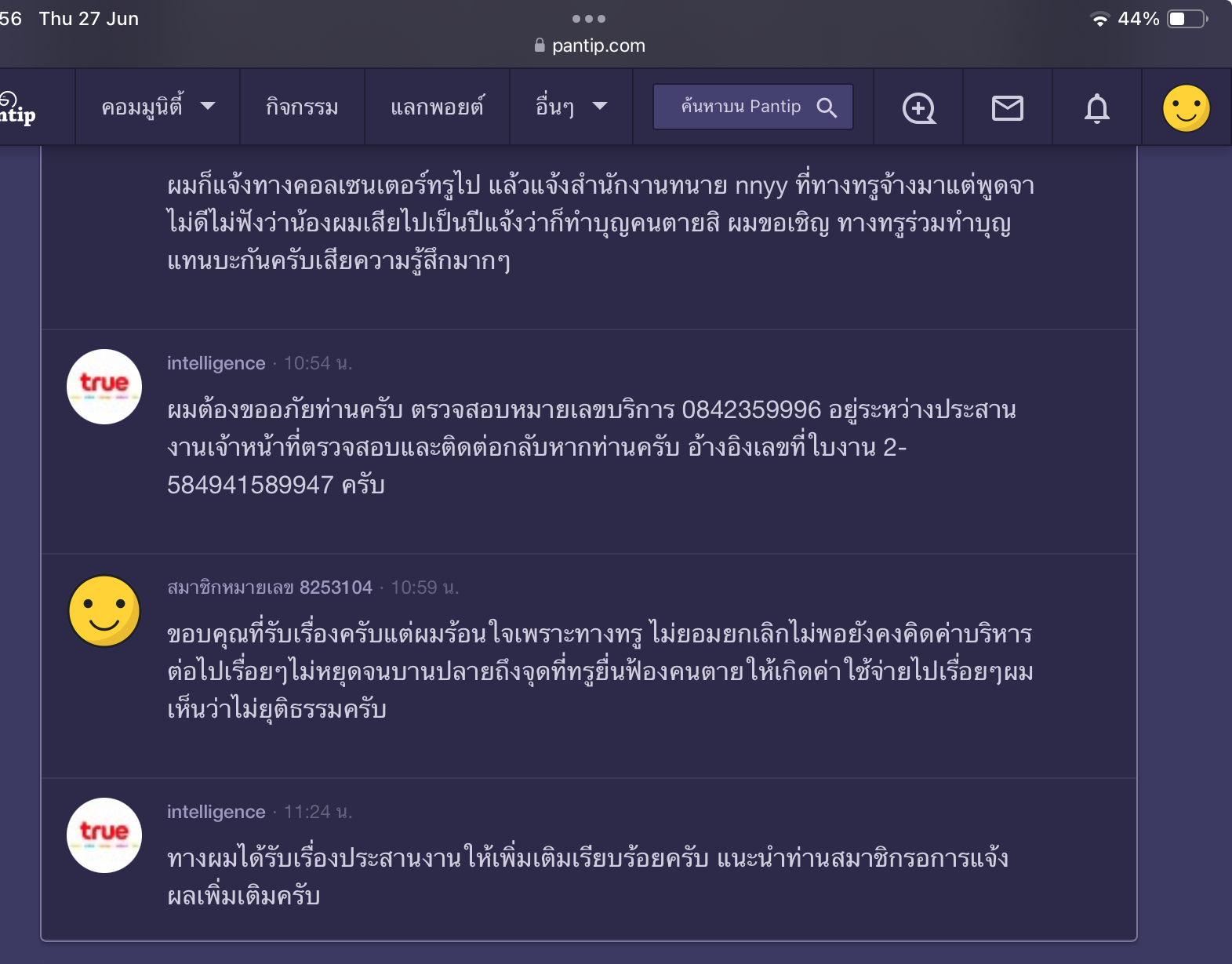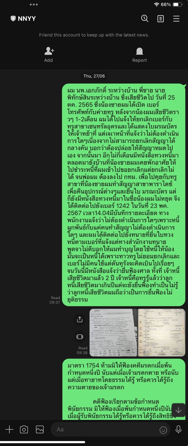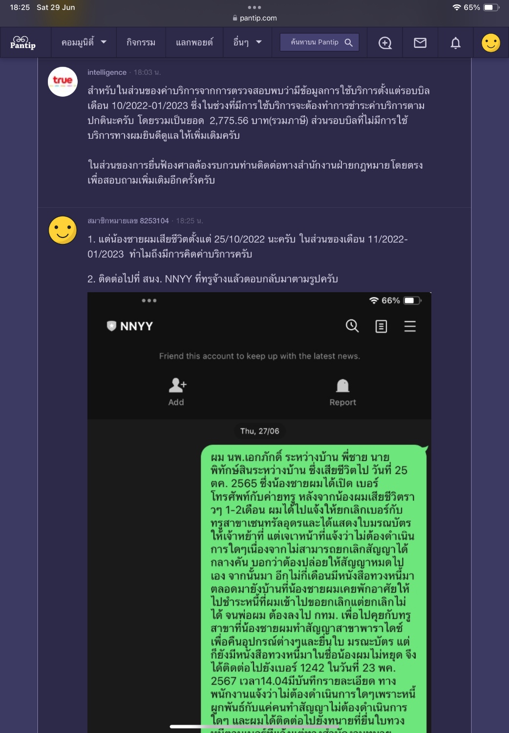 ความเดิม " ผม นพ.เอกภักดิ์ ระหว่างบ้าน พี่ชาย นาย พิทักษ์สินระหว่างบ้าน ซึ่งเสียชีวิตไป วันที่ 25 ตค. 2565 ซึ่งน้องชายผมได้เปิด เบอร์โทรศัพท์กับค่ายทรู หลังจากน้องผมเสียชีวิตราวๆ 1-2เดือน ผมได้ไปแจ้งให้ยกเลิกเบอร์กับ ทรูสาขาเซนทรัลอุดรและได้แสดงใบมรณะบัตรให้เจ้าหน้าที่ แต่เจ้าหน้าที่แจ้งว่าไม่ต้องดำเนินการใดๆเนื่องจากไม่สามารถยกเลิกสัญญาได้กลางคัน บอกว่าต้องปล่อยให้สัญญาหมดไปเอง จากนั้นมา อีกไม่กี่เดือนมีหนังสือทวงหนี้มาตลอดมายังบ้านที่น้องชายผมเคยพักอาศัยให้ไปชำระหนี้ที่ ผมเข้าไปขอยกเลิกแต่ยกเลิกไม่ได้ จนพ่อผม ต้องลงไป กทม. เพื่อไปคุยกับทรูสาขาที่น้องชายผมทำสัญญาสาขาพาราไดซ์เพื่อคืนอุปกรณ์ต่างๆและยื่นใบ มรณะบัตร แต่ก็ยังมีหนังสือทวงหนี้มาในชื่อน้องผมไม่หยุด จึงได้ติดต่อไปยังเบอร์ 1242 ในวันที่ 23 พค. 2567 เวลา14.04 มีบันทึกรายละเอียด ทางพนักงานแจ้งว่าไม่ต้องดำเนินการใดๆเพราะหนี้ผูกพันธ์กับแค่คนทำสัญญาไม่ต้องดำเนินการใดๆ และผมได้ติดต่อไปยังสำนักงานทนายที่ทางทรูสั่งให้ยื่นใบทวงหนี้ตามเบอร์ที่แจ้งแต่ทางสำนักงานทนายพูดจาไม่ดีบอกให้ผมทำบุญโดยใช้หนี้ให้น้อง โดยไม่ได้รับฟังว่าน้องผมเสียชีวิตไปร่วม 2-ปีแล้ว มันจะเป็นหนี้ที่เกิดได้เพราะทางทรูไม่ยอมยกเลิกและเบอร์ไม่มีคนใช้แต่ดันทุรังจะคิดเงินไปเรื่อยๆ จนวันนี้มีหนังสือแจ้งว่ายื่นฟ้องศาล ทั้งที่ เจ้าหนี้เสียชีวิตมาแล้ว 2 ปี เจ้าหนี้คือทรูรู้แล้วว่าลูกหนี้เสียชีวิตมาเกินปีแต่จะยังยื่นฟ้องทำเป็นไม่รู้ว่าลูกหนี้เสียชีวิตผมถือว่าเป็นการยื่นฟ้องไม่ยุติธรรม" ทางทรูได้เข้ามาตอบผมหลังไมค์ซึ่งผมยังไม่เข้าใจและยังติดใจดังนี้และยังคงคิกว่าไม่ยุติธรรม