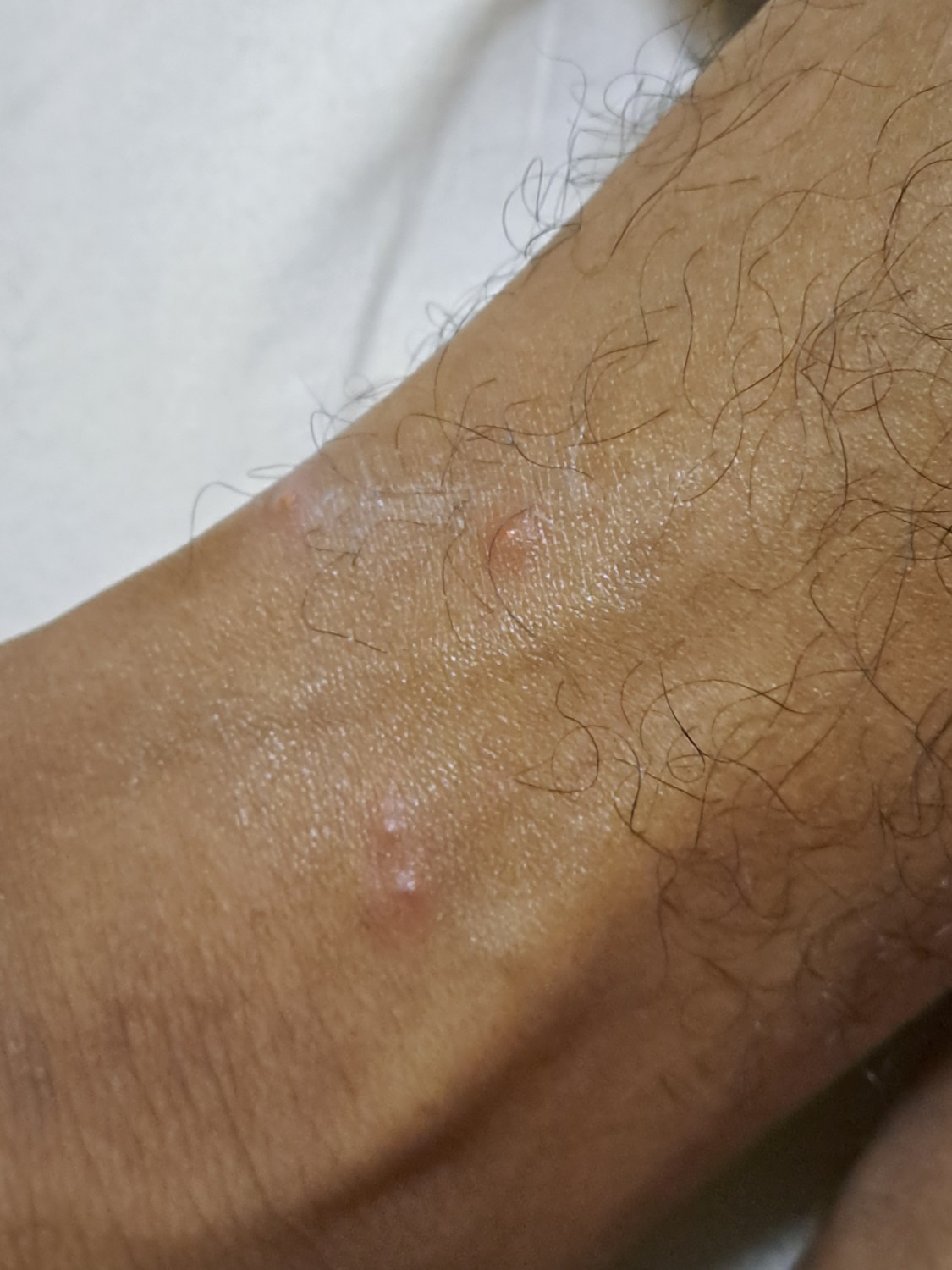 มีตุ่มเเดงขึ้นที่ขา เเละเหมือนกำลังเริ่มขึ้นที่เเขน เเต่ยังไม่เห็นชัดมากครับ เเต่ขึ้นที่ขาซ้าย5ตุ่ม เเต่ขาขวาขึ้นเเค่ตุ่มเดียวครับ เหมือนจะเริ่มขึ้นมาเรื่อยๆครับ ไม่มีอาการหรือคันอะไรเลยครับ รบกวนผู้ร