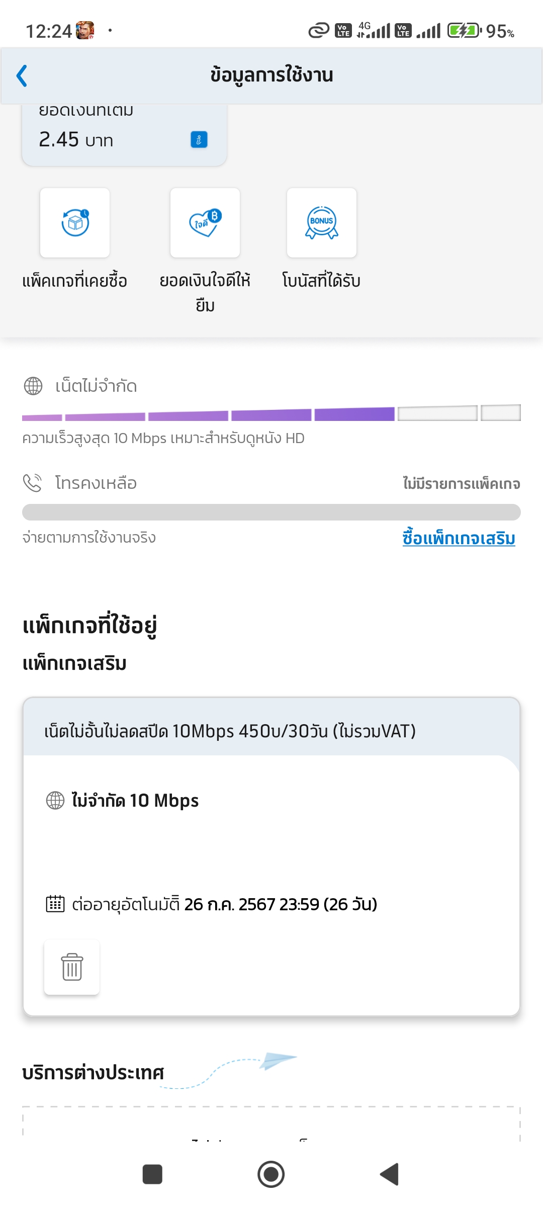แพ็กเกจ เน็ตไม่อั้นเร็ว 4 Mbps นาน 90 วัน (ใช้งาน Youtube ไม่อั้น เร็ว 384Kbps) ใช้งานได้ถึง 16/03/2026 23:59:59 เช็กเงิน เช็กเน็ตคงเหลือ หรือซื้อแพ็กเกจเสริมเฉพาะสำหรับค