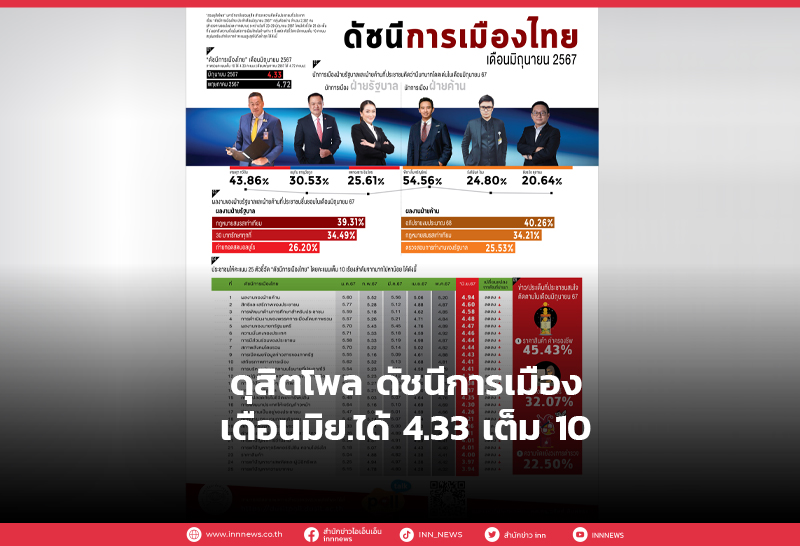 ดัชนีการเมืองไทย ประจำเดือนมิถุนายน 2567” จากกลุ่มตัวอย่างจำนวน 2,367 คน สำรวจทางออนไลน์และภาคสนาม ระหว่างวันที่ 23-29 มิถุนายน 2567 โดยมีตัวชี้วัด 25 ประเด็นที่บ่งบอกถึงความเชื่อมั่นต่อการเมืองไทยในด้านต่าง ๆ ซึ่งแต่ละตัวชี้วัดจะมีคะแนนเต็ม 10 คะแนน โดย พบว่า กลุ่มตัวอย่างให้คะแนนภาพรวมดัชนีการเมืองไทยประจำเดือนมิถุนายน 2567 เฉลี่ย 4.33 คะแนน ลดลง จากเดือนพฤษภาคม 2567 ที่ได้ 4.72 คะแนน