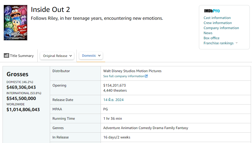Inside Out 2 ทำรายได้ทะลุพันล้าน เป็นเรื่องแรกของปี 2024