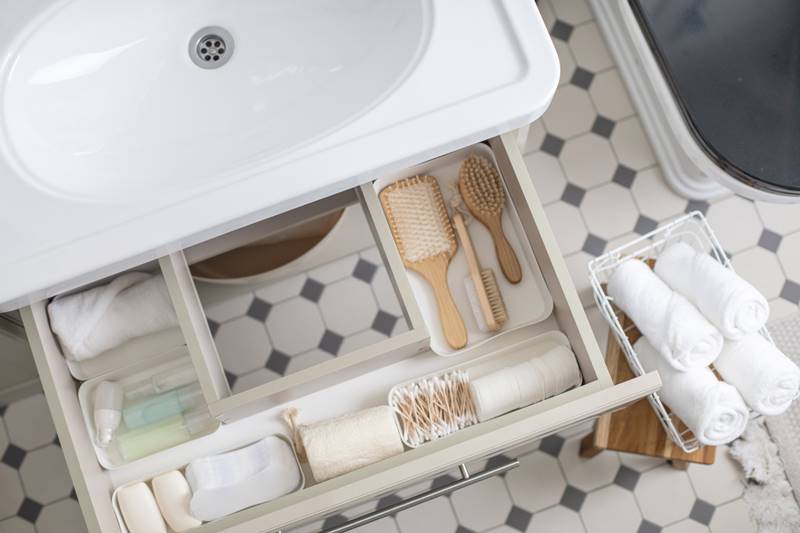 ข้าวของที่ต้องใช้แค่ในห้องน้ำ เช่น แปรงสีฟัน ยาสีฟัน น้ำยาบ้วนปาก เมคอัพรีมูฟเวอร์ควรเก็บไว้รวมกันให้ใกล้กับอ่างล้างหน้าจะได้ใช้งานได้สะดวกที่สุด ส่วนแชมพู ครีมนวดผม สบู่ ครีมอาบน้ำก็ควรเก็บไว้ในพื้นที่เปียกจะได้หยิบใช้ได้ง่ายเช่นกัน
