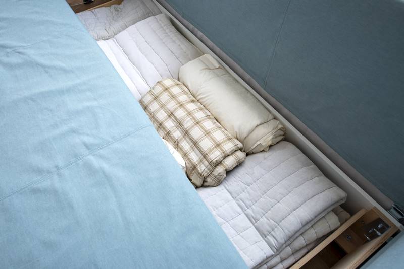 เก็บผ้าห่ม ผ้านวม หมอนอิง หนังสือ และข้าวของกระจุกกระจิกไว้ใต้เตียง ใช้กล่องธรรมดาหรือกล่องล้อเลื่อนซ่อนใต้เตียงก่อน เป็นพื้นที่ที่เข้าถึงได้สะดวก นำมาของมาใช้ได้รวดเร็วและทำให้พื้นที่ในห้องนอนมีที่ว่างเพิ่มขึ้นด้วย