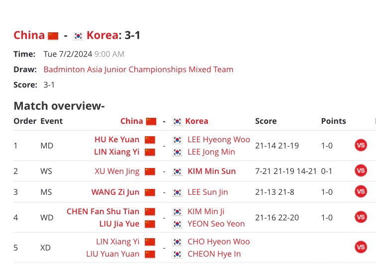 ทีมชาติจีนสามารถเอาชนะทีมชาติเกาหลีใต้ไปด้วยคะแนนทีม 3-1โดยทีมชาติจีนสามารถเอาชนะในประเภท ชายคู่ ชายเดี่ยว และหญิงคู่