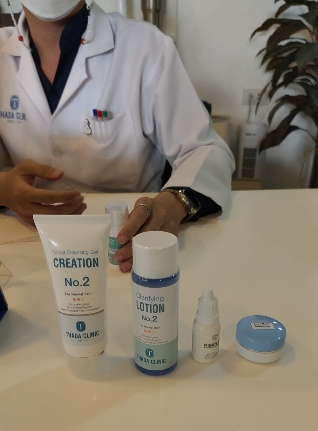 พอเราเข้ามาที่คลินิกก็มากรอกประวัติก่อนเลยแล้วก็เข้าไปพบคุณหมอธาดา ตอนเข้าไปพบคุณหมอคุณหมอก็จะแนะนำวิธีดูแลรักษาตัวเองไม่ให้เกิดสิว อธิบายคร่าวๆว่าสิวเกิดขึ้นได้จากอะไรบ้าง แล้วก็บอกวิธีรักษาแต่ละประเภทของคนที่เป็นสิว