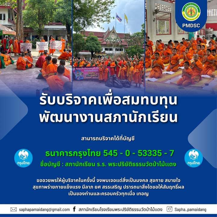 เพื่อการพัฒนาที่ดีขึ้นเราจึงทำเต็มที่ ทางคณะกรรมการสภานักเรียนโรงเรียนพระปริยัติธรรมวัดป่าไม้เเดง ขออนุโมทนาบุญกับผู้ร่วมทำบุญในครั้งนี้ด้วย ขอให้ประสบพบเจอเเต่สิ่งอันเป็นมงคล เเละมีพระรัตนตรัยเป็นที่ตั้ง