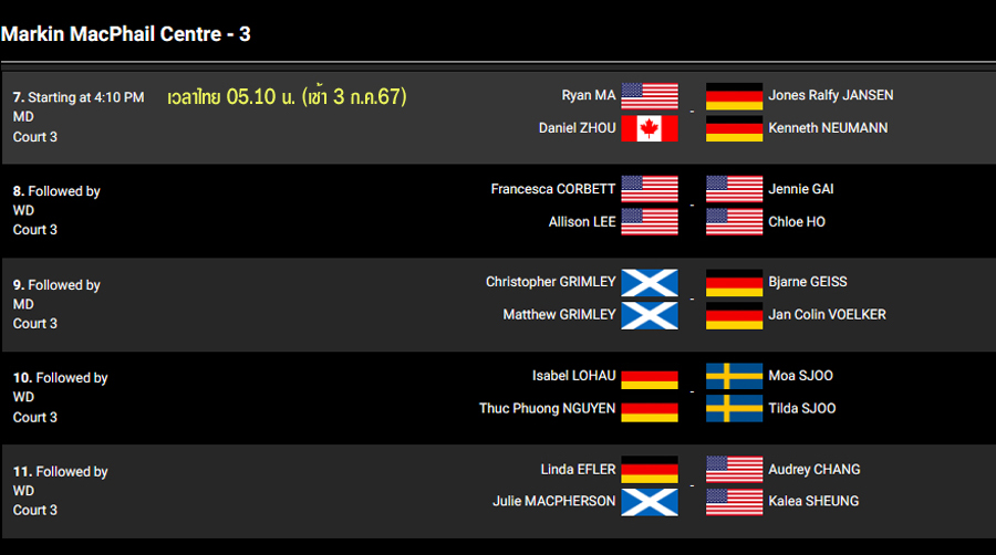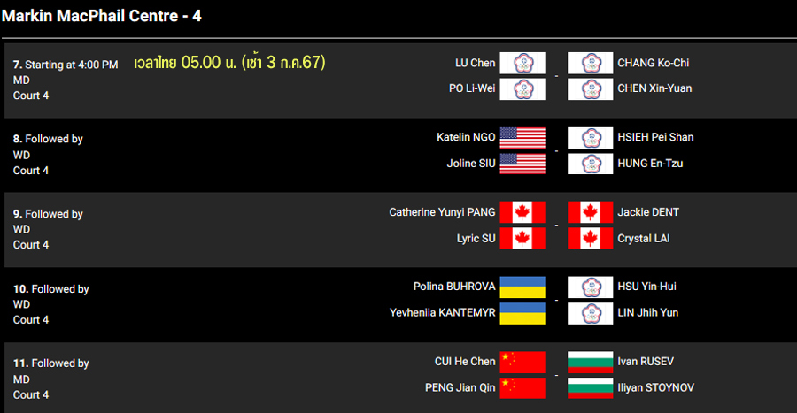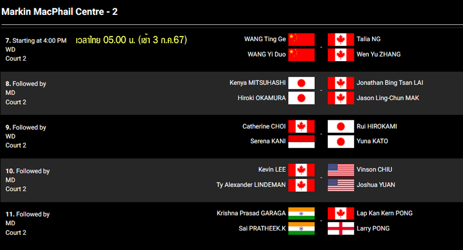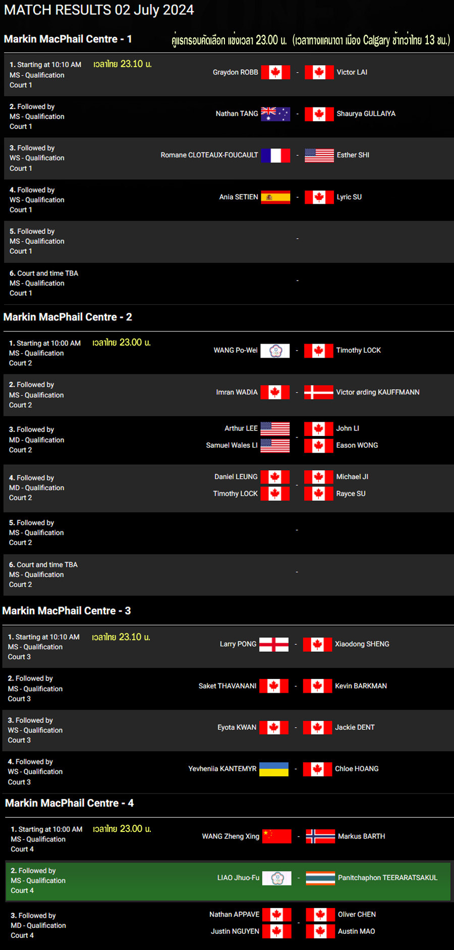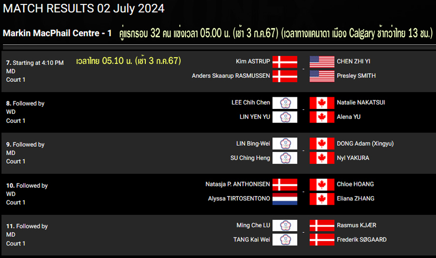 โปรแกรมการแข่งขันแบดมินตัน YONEX Canada Open 2024 : รอบคัดเลือก และ รอบ 32 [MD]&[WD] (2 ก.ค. 67) (คู่แรกเวลา 23.00 น.)