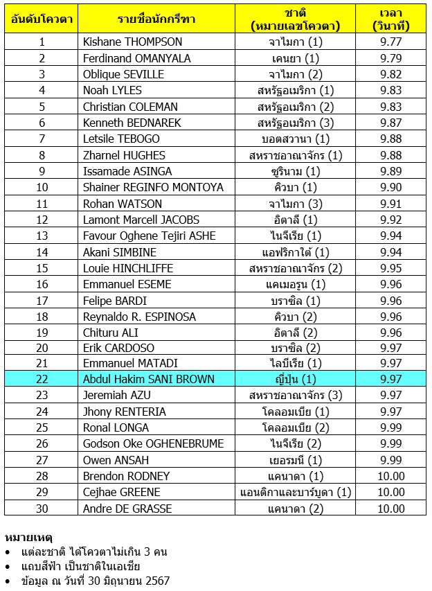 อันดับโควตาของนักกรีฑาที่วิ่งไม่เกิน 10 วินาที มี 30 คน ซึ่งถ้ากรีฑาโลกใช้กฎเกณฑ์ตามข้างบน ใน Final List จะตัดเหลือ 28 คน