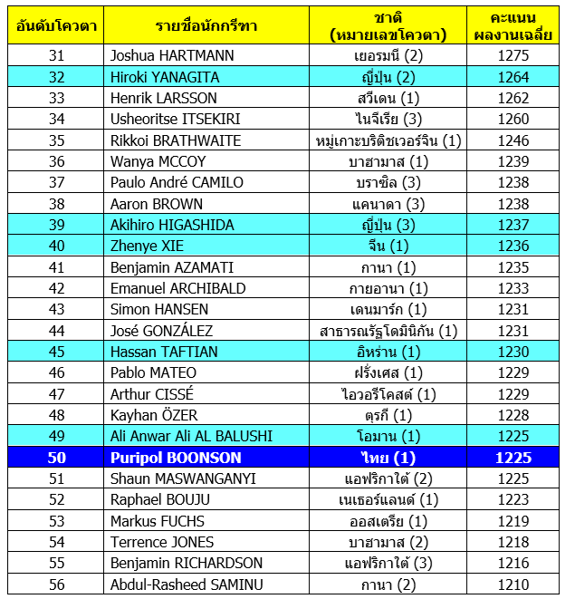 อันดับโควตา 31-56 โดย "บิว" อยู่อันดับ 50 (แถบสีน้ำเงิน) โดนแซงไป 5 คนตามที่แจ้งในกระทู้ก่อน (3 คนในตัวกระทู้ก่อน คือ บาฮามาส, เดนมาร์ก และเยอรมนี + ฝรั่งเศส จากความเห็นที่ 8 ในกระทู้ก่อน + ตุรกี จากความเห็นที่ 25 ในกระทู้ก่อน)