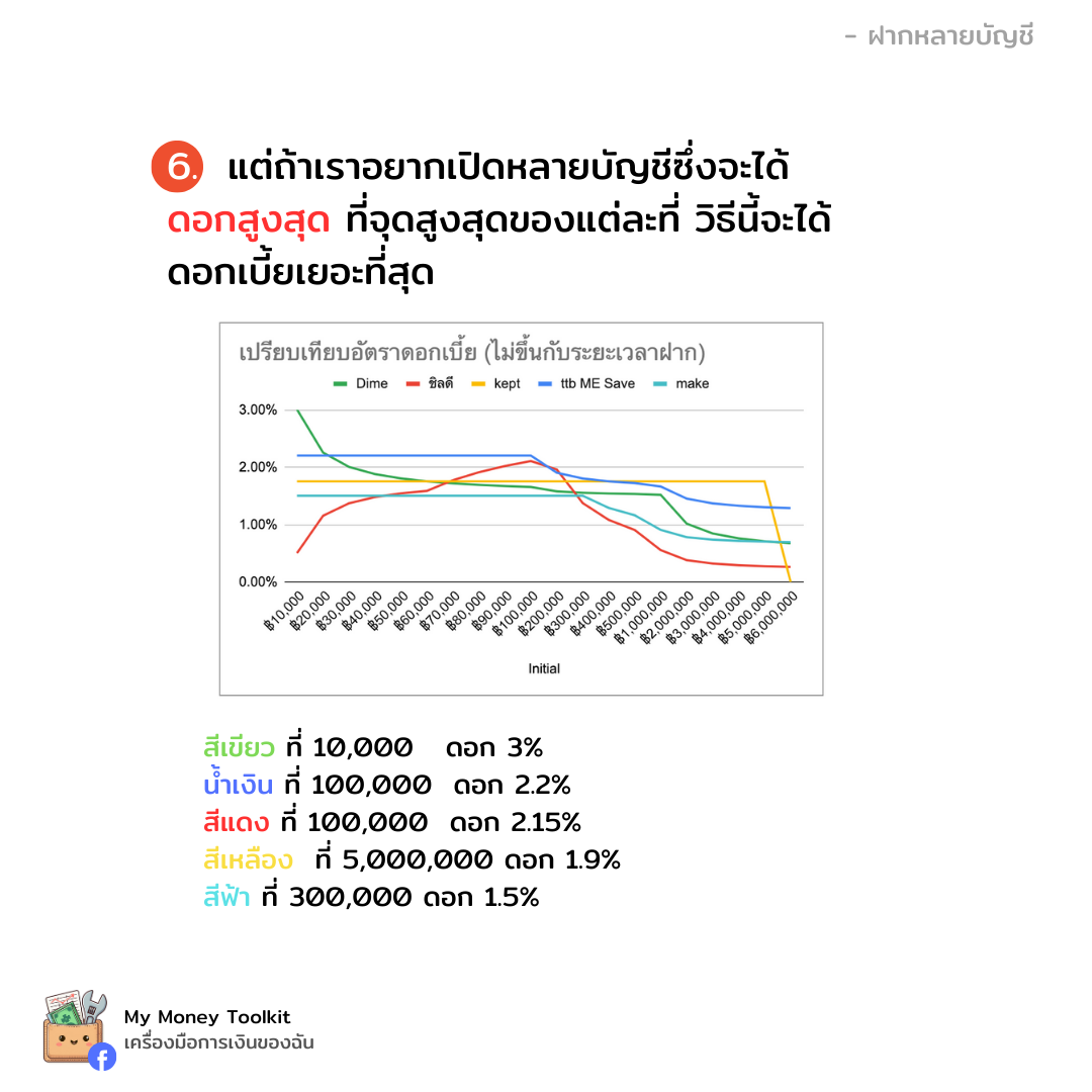 จะเห็นได้ว่าถ้าฝากที่เดียวบางธนาคารจะได้ดอกเยอะกว่าเพราะเจ้าที่ขั้นบันไดดอกลดลงมากเมื่อฝากเยอะ