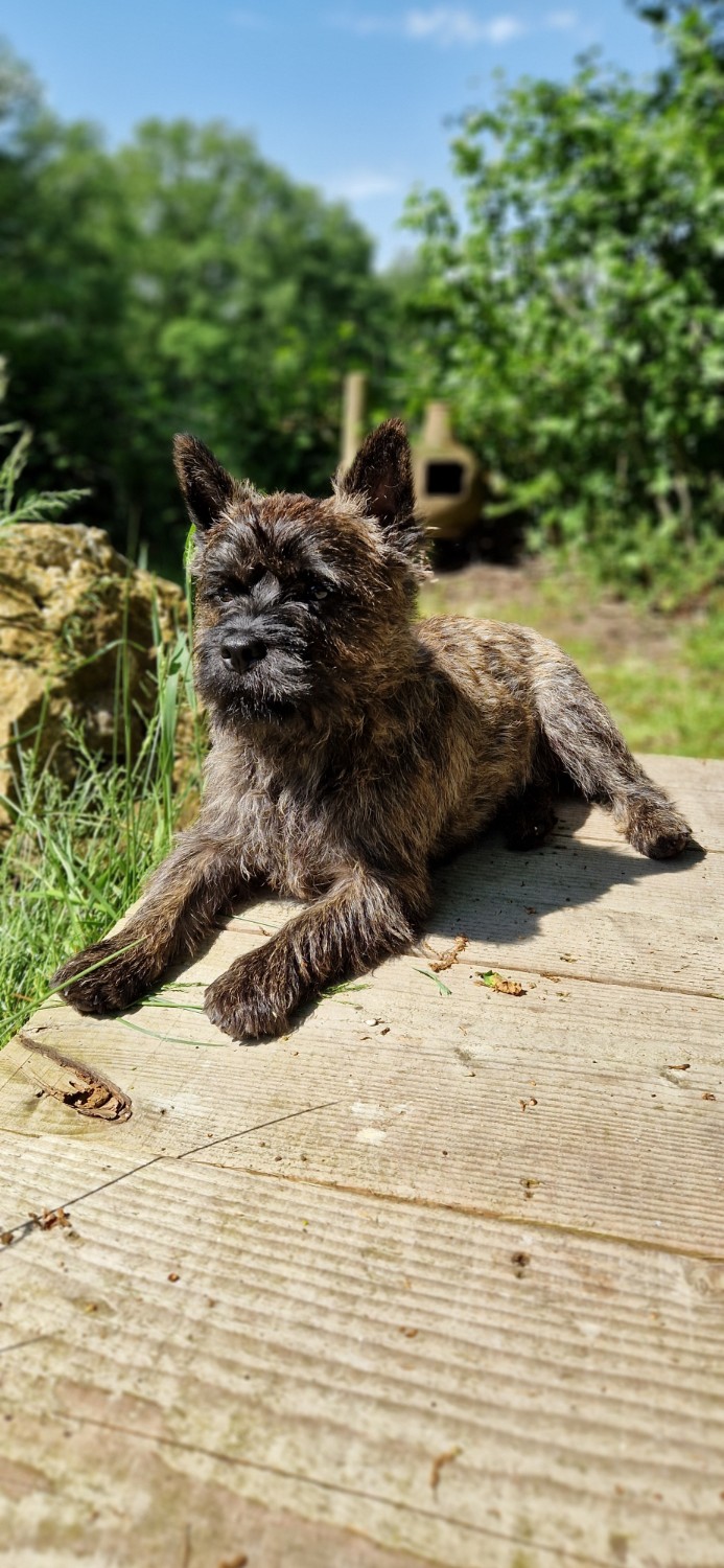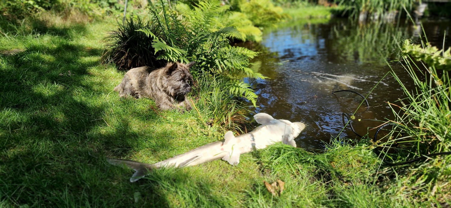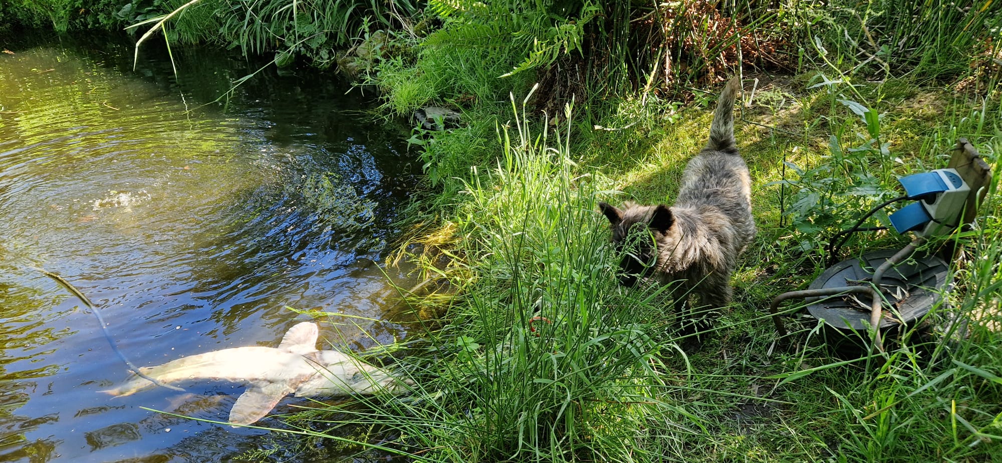 ที่บ้านเรามีสุนัขพันธุ์ cairn terrier ชื่อเจ้า ฟิน อายุ หนึ่งปีครึ่ง เจ้าฟินโตมากับปลาที่เราเลี้ยงไว้ที่สระหลังบ้าน ทุกๆเราก็จะพาเขาออกมาข้างนอกเพื่อให้เขาเดินเล่น เเละเราก็จะพาเขาไปที่ริมสระน้ำเพื่อสร้างความคุ้นเคยให้เราเจอกันทุกวัน พอเขาโตมาเขาจะได้ไม่กัดปลาเรา ปลาที่เราเลี้ยงจะเป็นพวก ปลา สเตอร์เจียน สระน้ำเล็กๆเเต่เต็มไปด้วยปลา