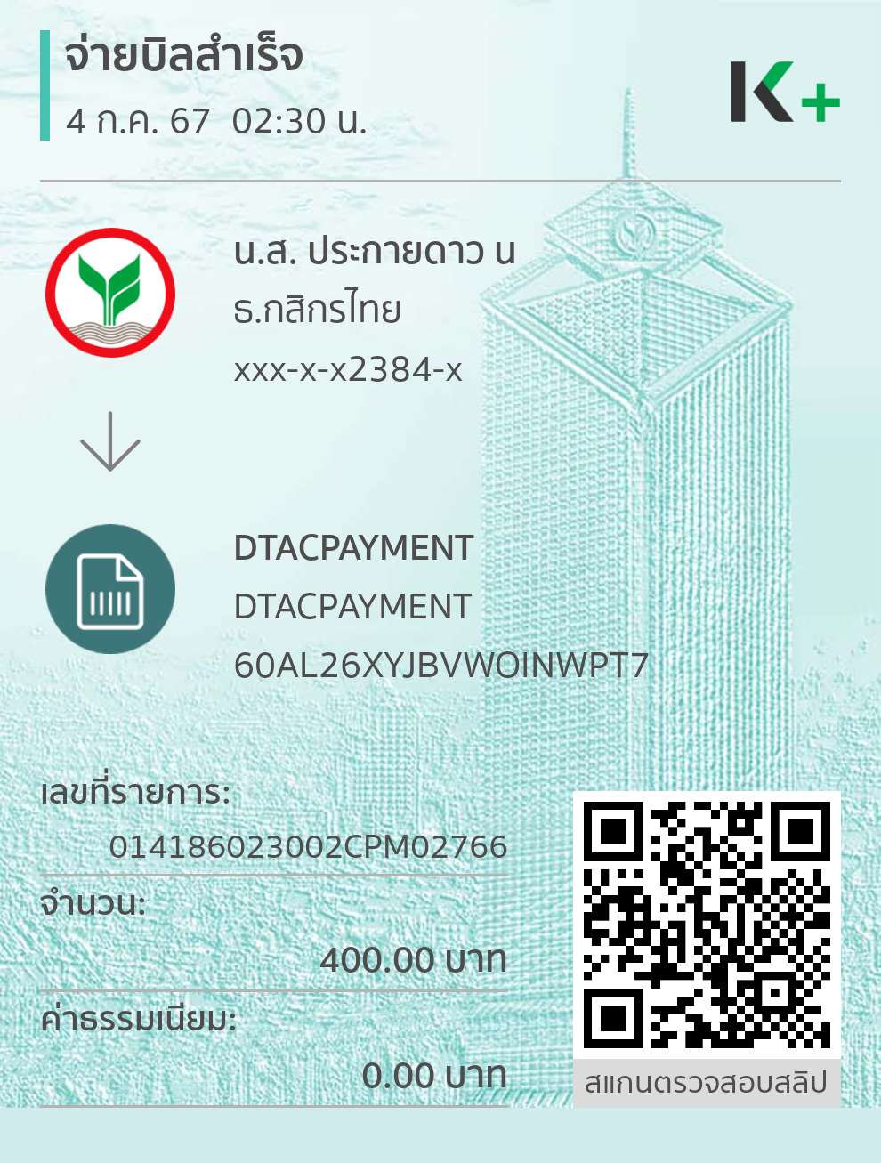 ตามนั้นเลยค่ะ ยอดค้างที่ต้องจ่ายก่อนคือ400 เราจ่ายไปแล้วแต่ยังขึ้นค้างชำระอยู่ แล้วไม่มีใบเสร็จหรืออะไรส่งมาเลย งงนะ