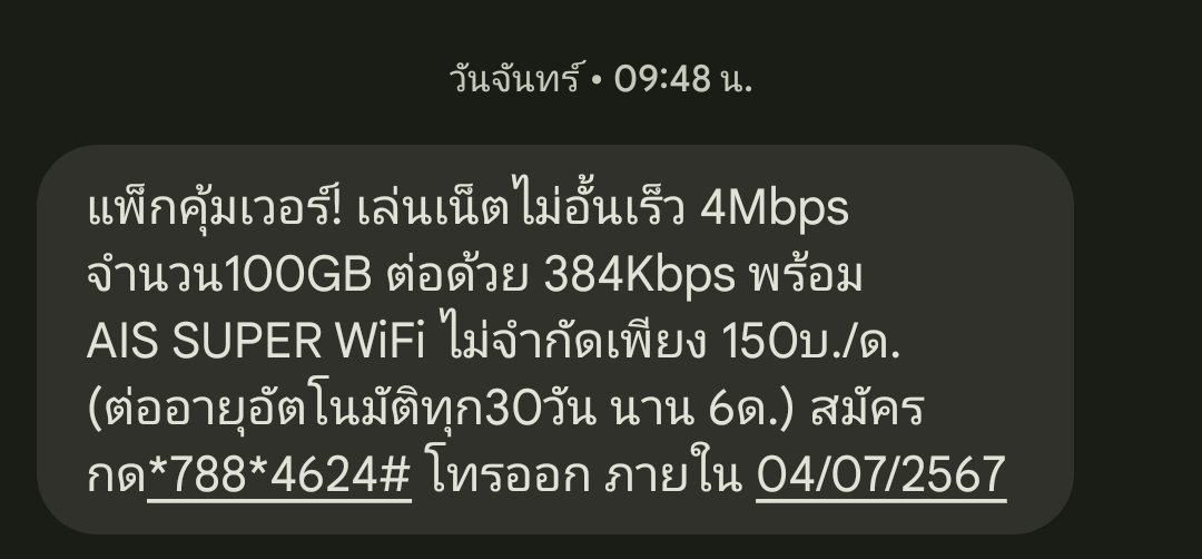 คือเราสมัครเน็ต 7 วัน 1 Mbps 99 บาท สมัครเมื่อวันที่ 1 มิย เวลา1ทุ่มกว่าๆ ข้อความก็ถูกส่งมาว่าสมัคร แต่เวลา2ทุ่ม ดันมีข้อความ AIs ส่งมาว่าเน็ตหมดแล้ว มันเกิดไรข