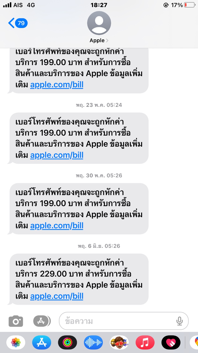 ผมถูกหักค่าบริการของแอปเปิ้ล ไม่รู้ค่าบริการอะไร ผมก็ไม่ได้ไปสมัคอะไรเลยนะครับตั้งแต่ได้โทรสัพเครื่องนี้ มา แอปเปิลไอดีผมก็เป็นคนสมัคเอง