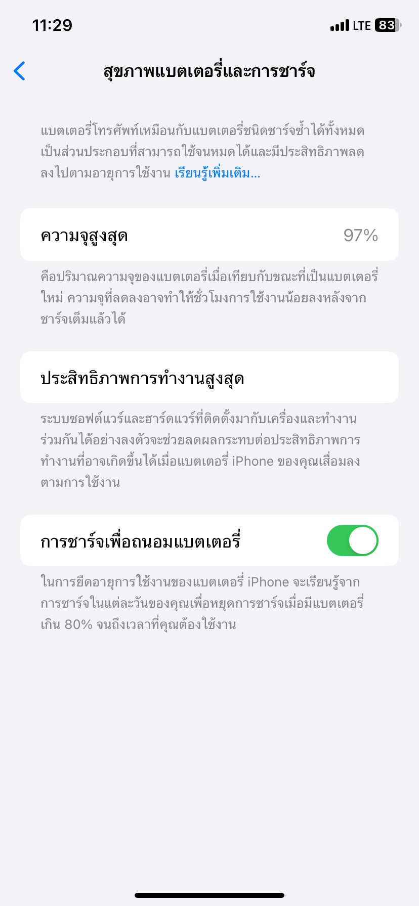 เพิ่งซื้อโทรศัพท์ iPhone 17 โปร Max ใช้งานห้าเดือน รอบชาร์จ 116 สุขภาพแบต 97% ใช้งานตั้ง ชาร์จที่ 90 ตลอดเปิดถึง 100 บ้าง แทบไม่เคยปล่อยให้เหลือ 20 เลย ไม่เคยเล่นไปชาร์จไป เมื่อไม่กี่อาทิตย์ก่อนแบต 98
