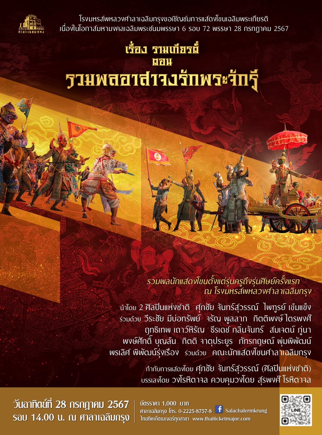 โรงมหรสพหลวงศาลาเฉลิมกรุง จัดการแสดงโขนเฉลิมพระเกียรติชุดพิเศษ เรื่องรามเกียรติ์ตอน “รวมพลอาสาจงรักพระจักรี” เนื่องในโอกาสมหามงคลเฉลิมพระชนมพรรษา พระบาทสมเด็จพระเจ้าอยู่หัวทรงเจริญพระชนมพรรษา 6 รอบ หรือ 72 พรรษา ในวันที่ 28 กรกฎาคม 2567 นับเป็นปีมหามงคลสมัยพิเศษยิ่ง ศิลปินนาฏศิลป์ชั้นครูร่วมสืบสาน รักษา ต่อยอด ด้านศิลปวัฒนธรรมของชาติ ถ่ายทอดศิลปะการแสดงโขน นาฏศิลป์ชั้นสูงของไทย นำแสดงโดย 2 ศิลปินแห่งชาติ ศุภชัย จันทร์สุวรรณ์ - ไพฑูรย์ เข้มแข็ง ร่วมด้วย วีระชัย มีบ่อทรัพย์ จรัญ พูลลาภ กิตติพงษ์ ไตรพงศ์ ฤทธิเทพ เถาว์หิรัญ ธีรเดช กลิ่นจันทร์ สมเจตน์ ภู่นา พงษ์ศักดิ์ บุญล้น กิตติ จาตุประยูร ภัทรกฤษณ์ พุ่มพิพัฒน์ พรเลิศ พิพัฒน์รุ่งเรือง ร่วมด้วย คณะนักแสดงโขนศาลาเฉลิมกรุง กำกับการแสดงโดย ศุภชัย จันทร์สุวรรณ์(ศิลปินแห่งชาติ) บรรเลงโดย วงโรหิตาจล ควบคุมวงโดย สุรพงศ์ โรหิตาจล