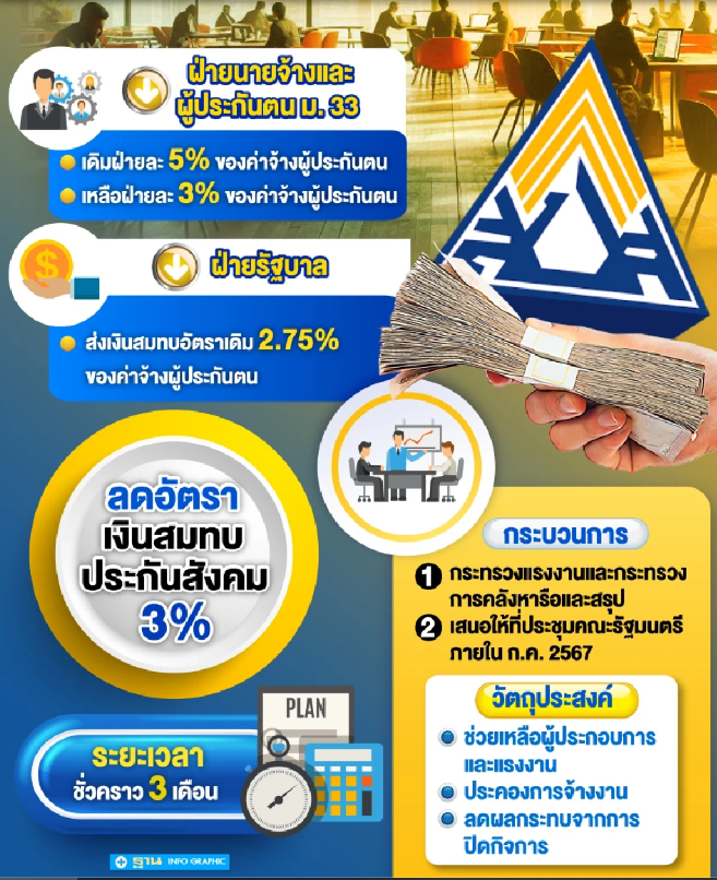 “ตอนนี้ได้ข้อสรุปแล้ว โดยจะดำเนินการในลักษณะเดียวกันกับช่วงโควิด แต่ในรายละเอียดนั้น กระทรวงการคลัง และกระทรวงแรงงาน กำลังหารือในขั้นสุดท้าย และจะเคาะตัวเลขที่ชัดเจนทั้งอัตราเงินสมทบกองทุนประกันสังคม และระยะเวลาการปรับลดที่เหมาะสมว่าจะใช้กี่เดือน และจากนั้นจะเสนอให้ครม.โดยเร็ว คาดว่า จะเสนอภายในเดือนกรกฎาคม 2567 นี้” แหล่งข่าว ระบุ