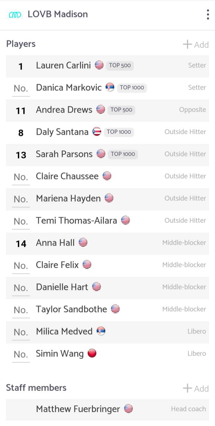 1. LOVB Atlanta 2. LOVB Austin 3. LOVB Houston 4. LOVB Madison 5. LOVB Nebraska (Omaha) 6. LOVB Salt Lake - บางทีมมีผู้เล่นต่าชาติมากกว่า 3 คน - LOVB Omaha เปลี่ยนชื่อเป็น LOVB Nebr