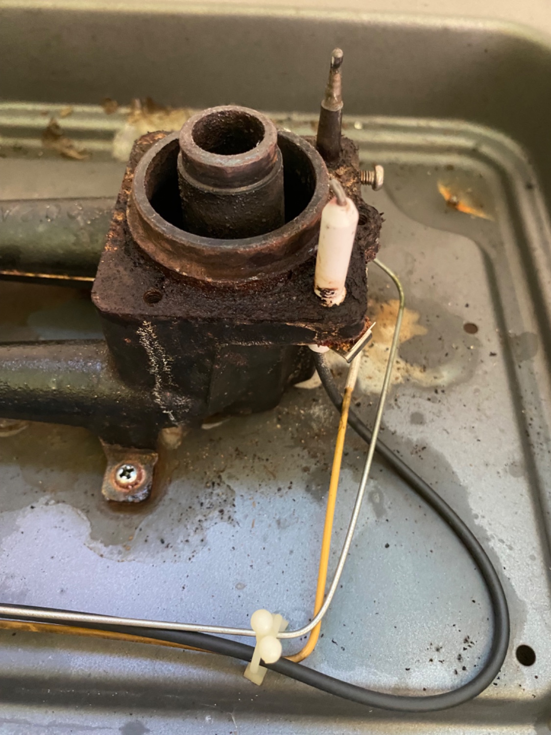 รถกวนสอบถามครับเกี่ยวกับเตาแก๊สแรงต่ำหัวคู่ เวลาเปิดแก๊สแล้วมีไฟพุ่งออกมาจากรูช่องอากาศบริเวณชุดสปาร์คเตาตามรูปที่วงไว้ ลองทำความสะอาดแล้ว หาลวดเส้นเล็กๆแหย่น