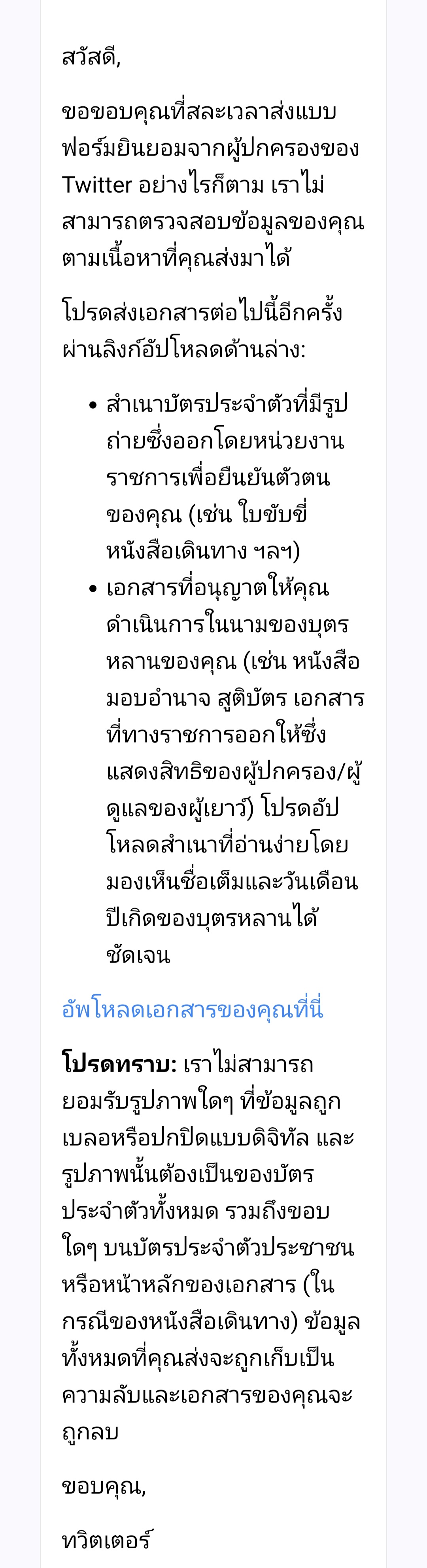 ตามหัวข้อกระทู้เลยค่ะ ทวิตเราโดนล็อคไปตอน5โมงเย็นวันนี้ เพราะเราไปเปลี่ยนวันเกิดค่ะ😭 เราได้ทำการกรอกฟอร์มเพื่อปลดล็อคบัญชีไปแล้ว แต่ตอน6โมงมีเมลแจ้งมาว่า"ไม่สามารถตรวจสอบข้อมูลของคุณได้"
