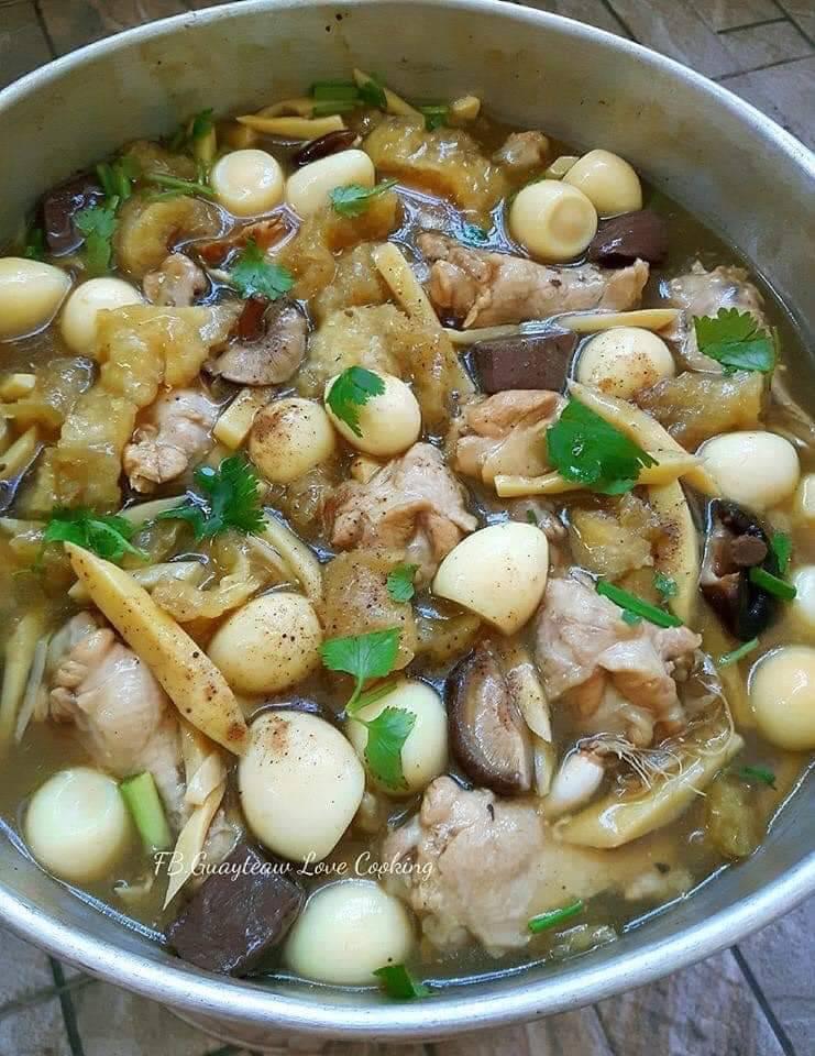 -จากนั้นตักโครงไก่ออกเหลือน่องไก่ไว้ ตั้งน้ำซุปต่อไป พอน้ำซุปเดือด ใส่หน่อไม้ ,ใส่กะเพาะปลา ,เห็ดหอม , ปรุงรสชาติด้วย ซีอิ๊วขาว , ใส่ซีอิ๊วดำหวานเพิ่มสีสันให้น่ากิน ,ใส่จิ๊กโฉว่ลงไปสักหน่อยเพิ่มความหอม (หากไม่มีก็ไม่ต้องใส่ค่ะ)