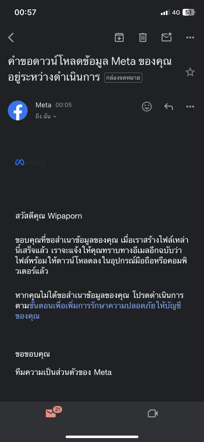 ท่าแบบ เข้าไปตั่งค่า ดาวน์โหลดข้อมูล แล้วส่งไปอีเมล์ ผมทำแล้ว แต่อีเมล์มันไม่ยอมส่งกลับบอกแค่ว่าอยู่ระหว่างดำเนินการ ไม่เห็นมีอะไรเกิดขึ้นสักที