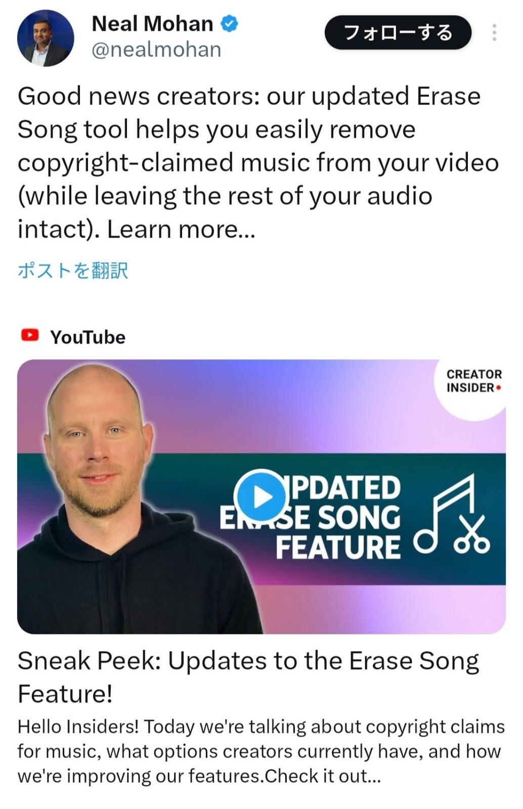 โดย นีล โมฮาน (Neal Mohan) ซีอีโอของ YouTube แชร์วิดีโอของ Creator Insider ลงบน X (ทวิตเตอร์) ระบุว่า "ขอประกาศข่าวดีสำหรับเหล่ายูทูบครีเอเตอร์ เครื่องมือ Erase Song จะช่วยนำเพลงที่มีการระบุลิขสิทธิ์ออกจากจากวิดีโอของคุณได้ โดยที่ยังเก็บเสียงอื่น ๆ ของคุณเอาไว้"