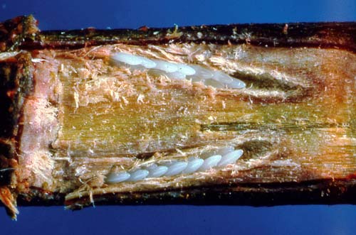 โดยทำเป็นถุงเก็บไข่ ถุงละประมาณ 25 ฟอง ฝังไปในกิ่งไม้อ่อน