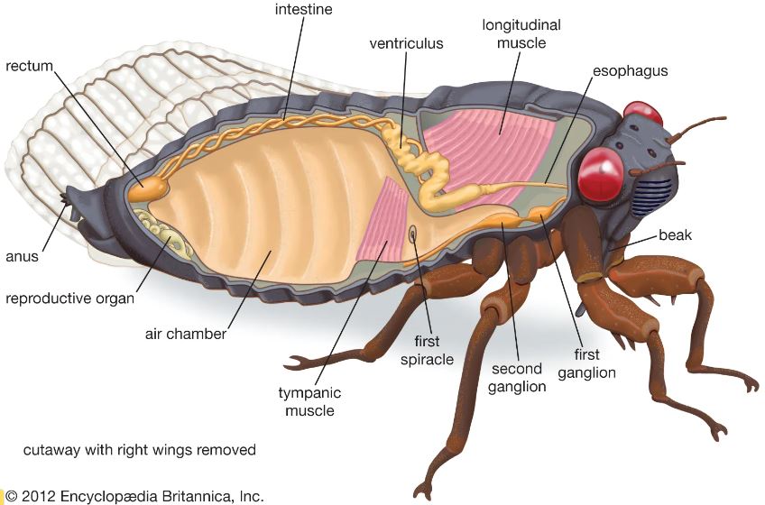 การสร้างเสียงของจักจั่น ทำโดยการเสียดสีอวัยวะส่วนที่เรียกว่า ทิมบาล (Tymbal)