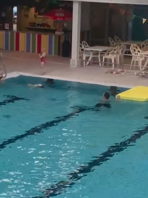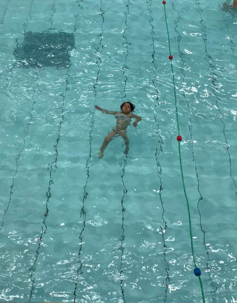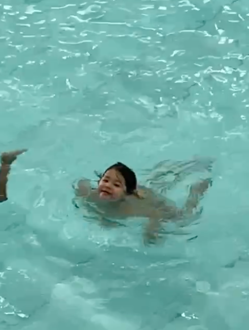 ขยับขึ้นมาขึ้นที่สูงขึ้นแล้ว เปลี่ยนมาสระที่ใหญ่ขึ้น อันนี้น้ำประมาณหน้าอกของเด็กๆ คุณครูกำลังสอนว่าต้องทำอะไรบ้าง ขึ้นนี้คือ ลอยตัวหงายหลังในน้ำ และใช้เท้ายันน้ำไปค่ะ (ไม่ใช่ตีน้ำนะคะ)