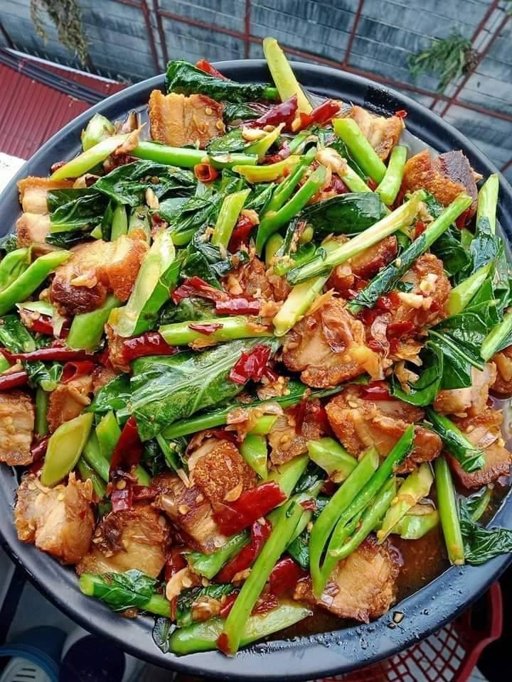 ตั้งกะทะใส่น้ำมันเล็กน้อยนำหมูกรอบลงไปตามด้วยพริกกระเทียมผัดให้หอมใส่น้ำนิดหน่อย
